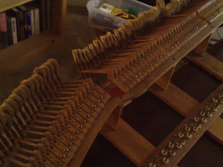 I am at a kind of standstill right now. I have to decide what to do with the keyboard, so I can level it, then I can regulate the mechanism, and refinish the hammers, and then I can put it back together to see how it works.